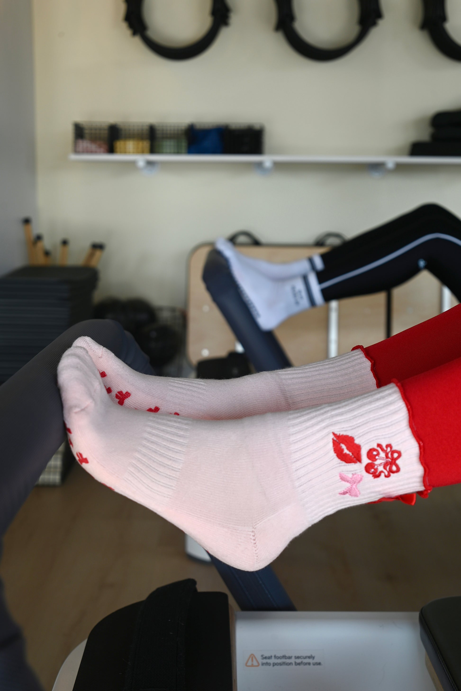 These light pink grip socks feature red bows, cherries, and lips with bow-shaped grips on the bottom—keeping you stylish and steady from reformer to mat. The perfect finishing touch to your workout look 🍒💋🎀