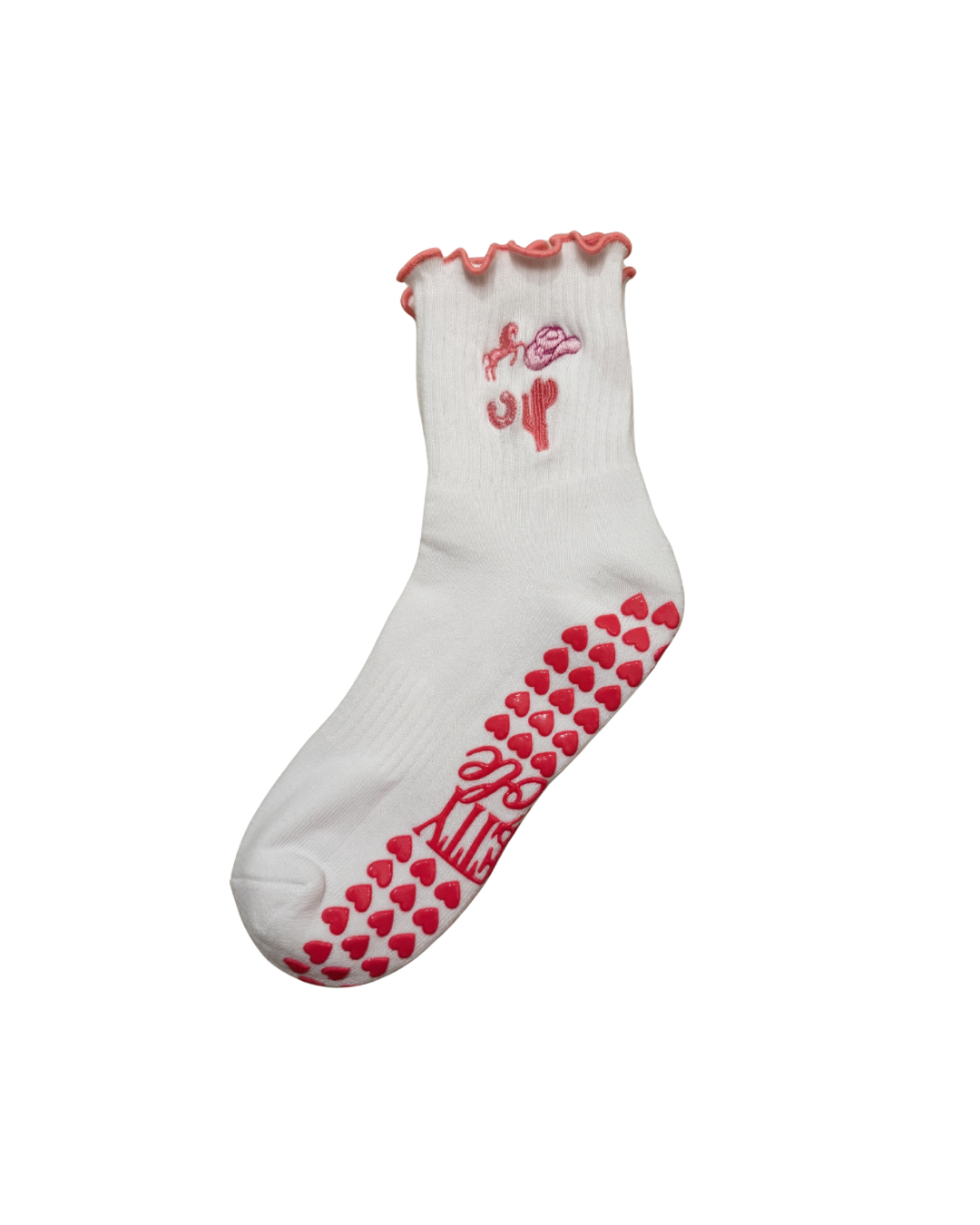 Saddle up in style with our Cowgirl Core grip socks — featuring pink western icons, ruffle trim, and heart-shaped grips for the cutest studio statement.