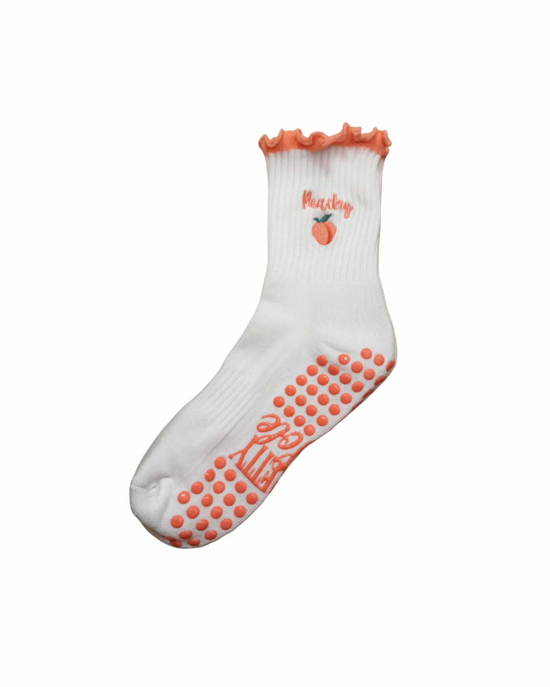 Your Pilates practice just got a whole lot juicier. These white grip socks feature sweet embroidered peaches, bold peach colored grips and a "Peachy" touch that is as cute as it is functional. She's fresh, flirty, and ready to move.