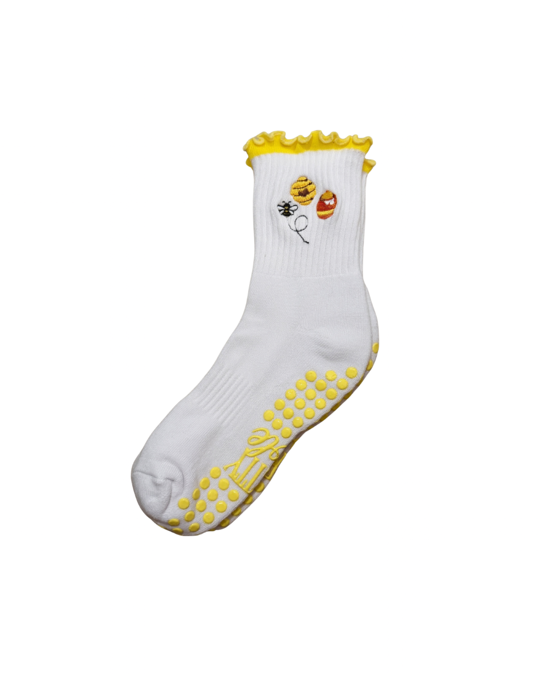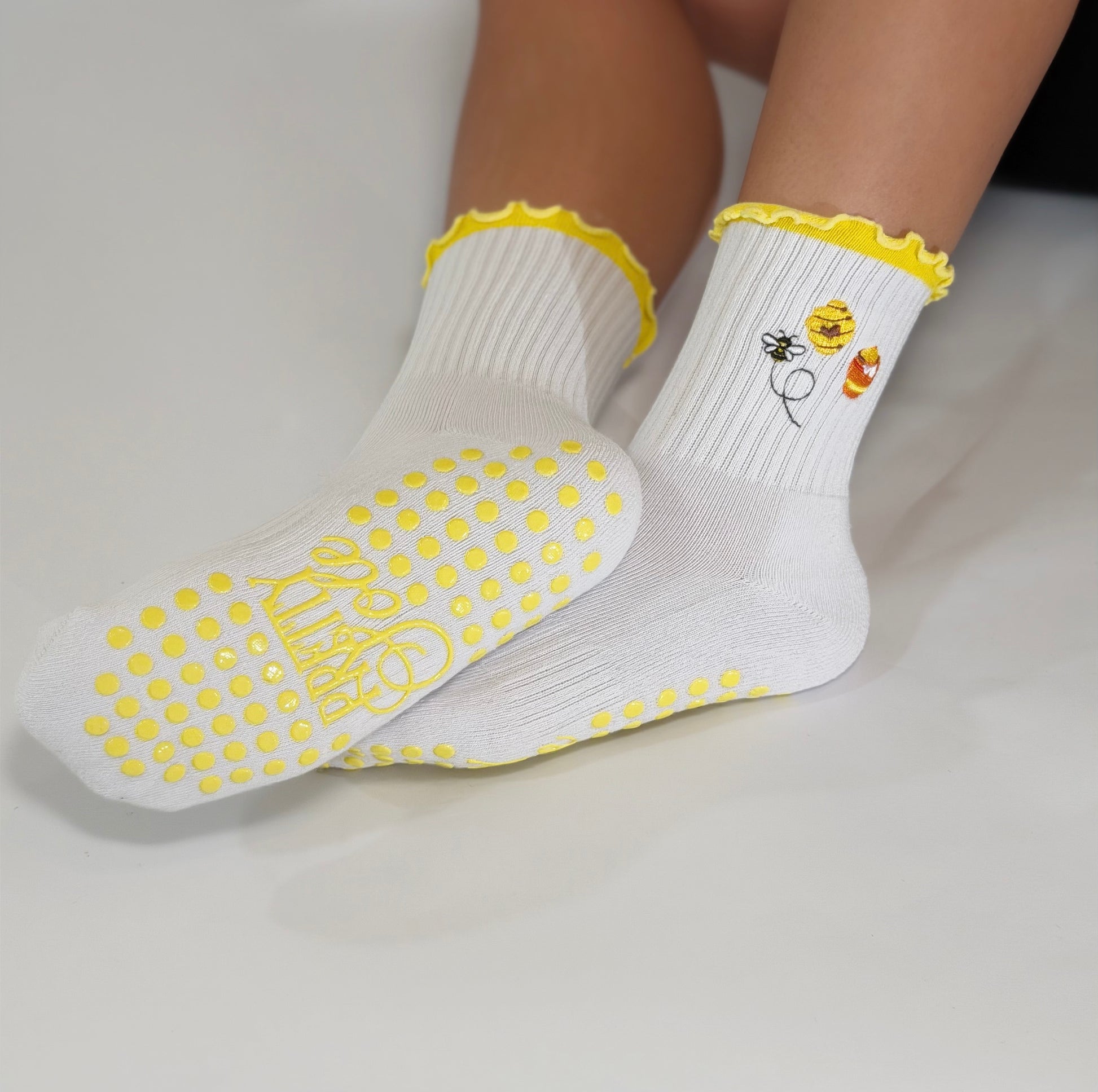Rule your workout in style with our Queen Bee Grip Socks — the perfect blend of comfort, and cuteness. Designed for the queens who own their flow, these socks feature a soft white base with a pop of yellow and charming embroidered honey details — a bee, bee hive, and honey pot.