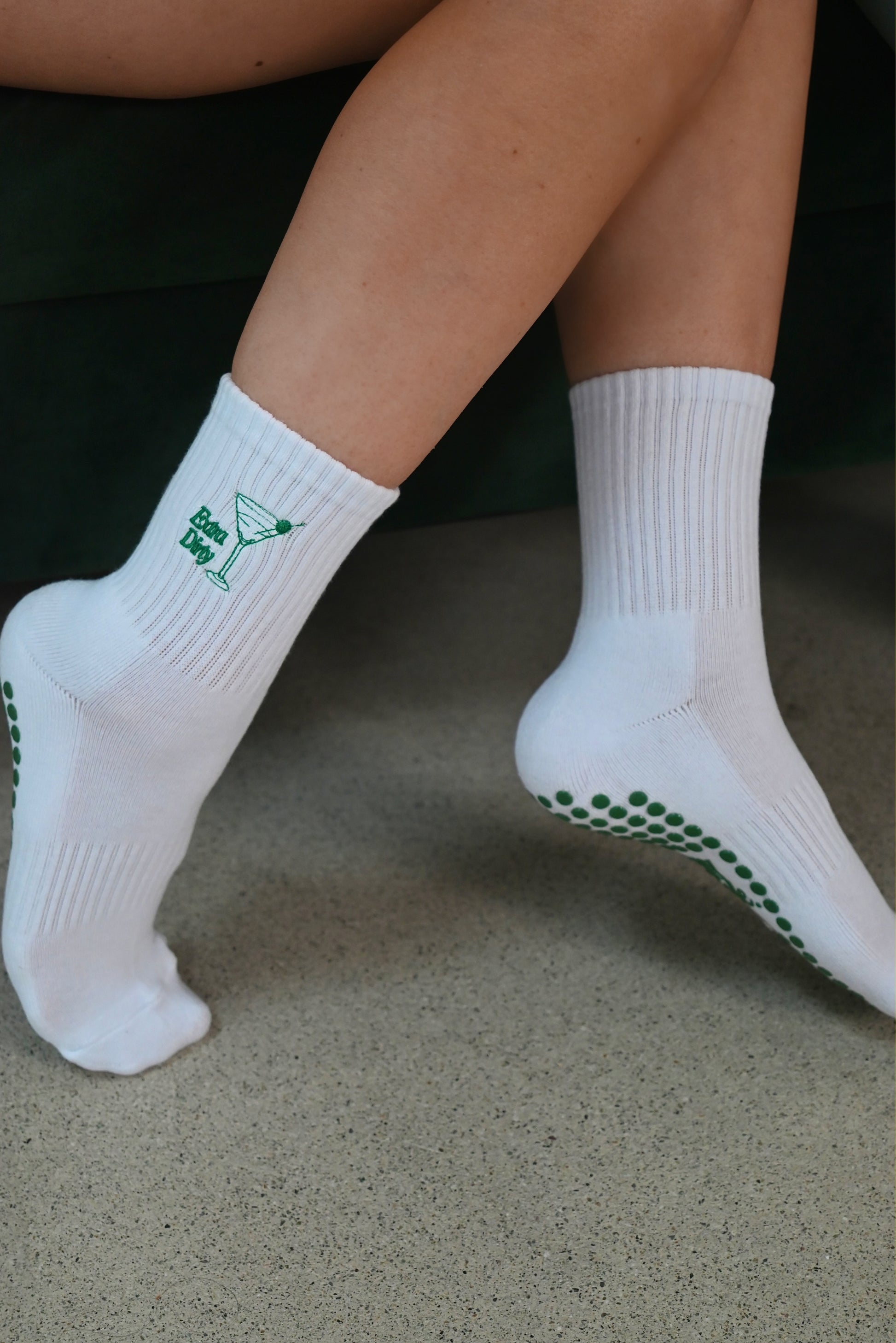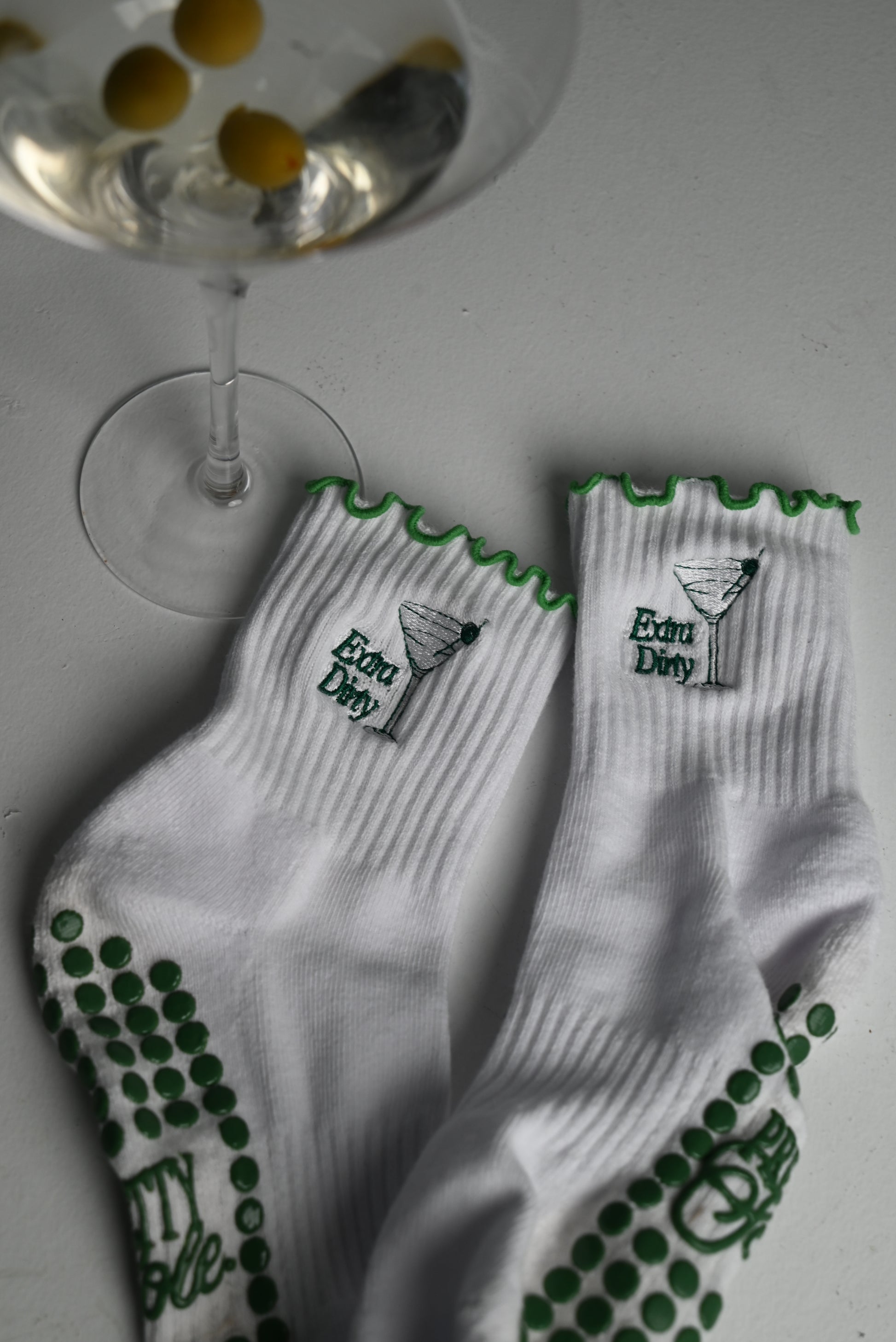 Step into your power with our Cocktail Cutie grip sock - where studio style meets happy hour sass. Featuring a soft white base, bold green non-slip grips, and a martini glass detail embroidered with "Extra Dirty," this sock is made for the girls who work hard and play cute.
