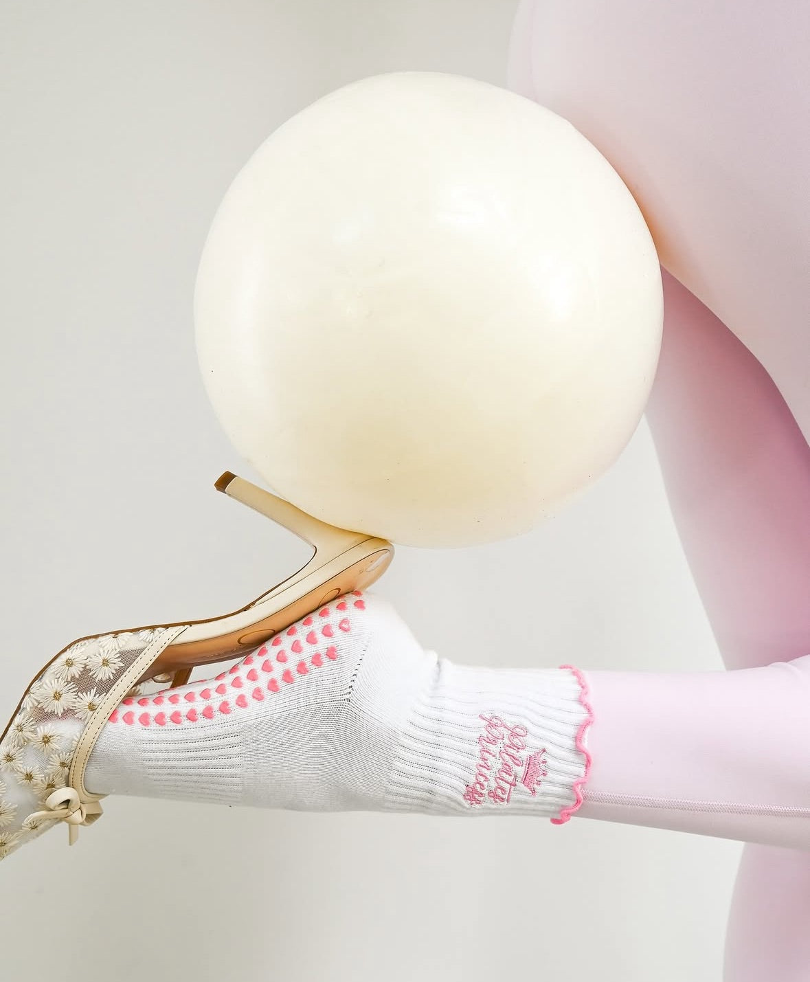 Channel your inner royalty with our Pilates Princess grip socks - designed for the babes who bring grace and sparkle to every exercise. With plush pink heart grips, a ruffled trim, and "Pilates Princess" stitched in soft script under a crown, these socks are made to serve looks and stability.